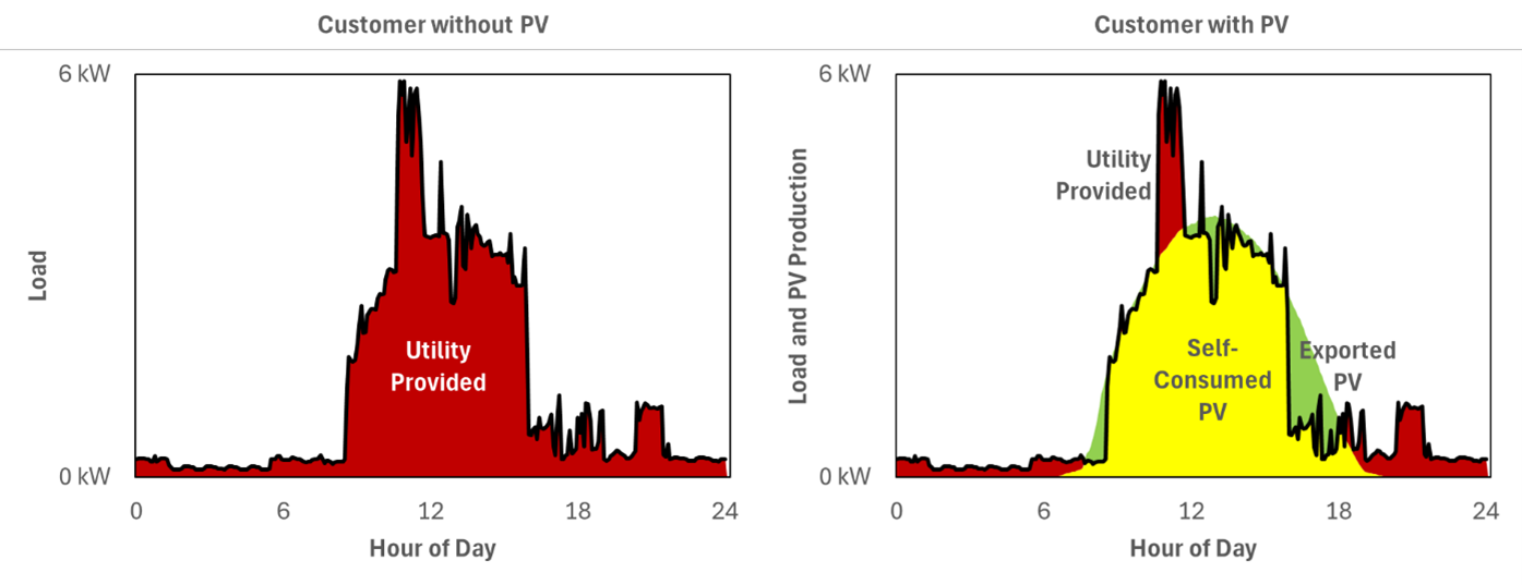 Figure 1 illustrates what we mean by PV self-consumption. Each graph represents the same customer’s load over the course of a day under two different scenarios: customer has no PV (left graph) and customer has PV (right graph). For the customer without PV, the utility provides all consumed energy.