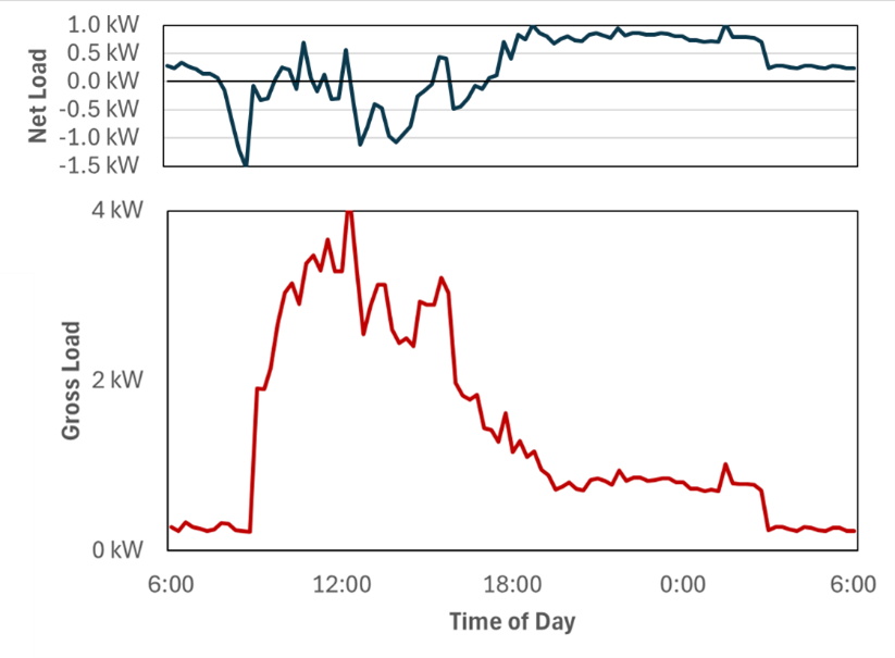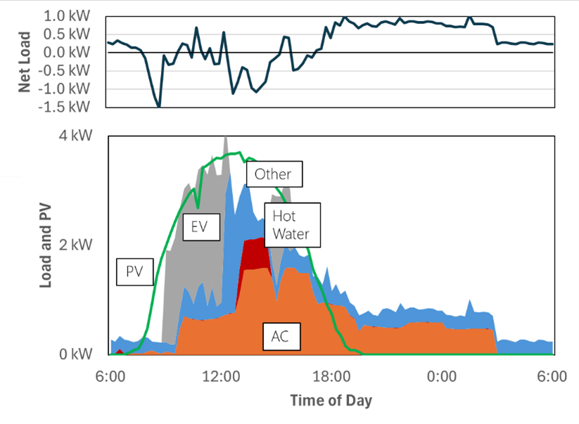 Remarkably, as shown in Figure 3, the home’s net load never exceeded 1 kW even with all these activities occurring on a peak-load day. The AC was set at 69°F for all hours except the evening (5 pm to 9 pm), when the thermostat was increased to help reduce peak load. A smart switch scheduled water heating to occur in the middle of the day. And EV charging consumed excess solar production.