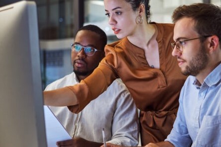 Image of people working together in front of a computer – Account Executive – Utilities East